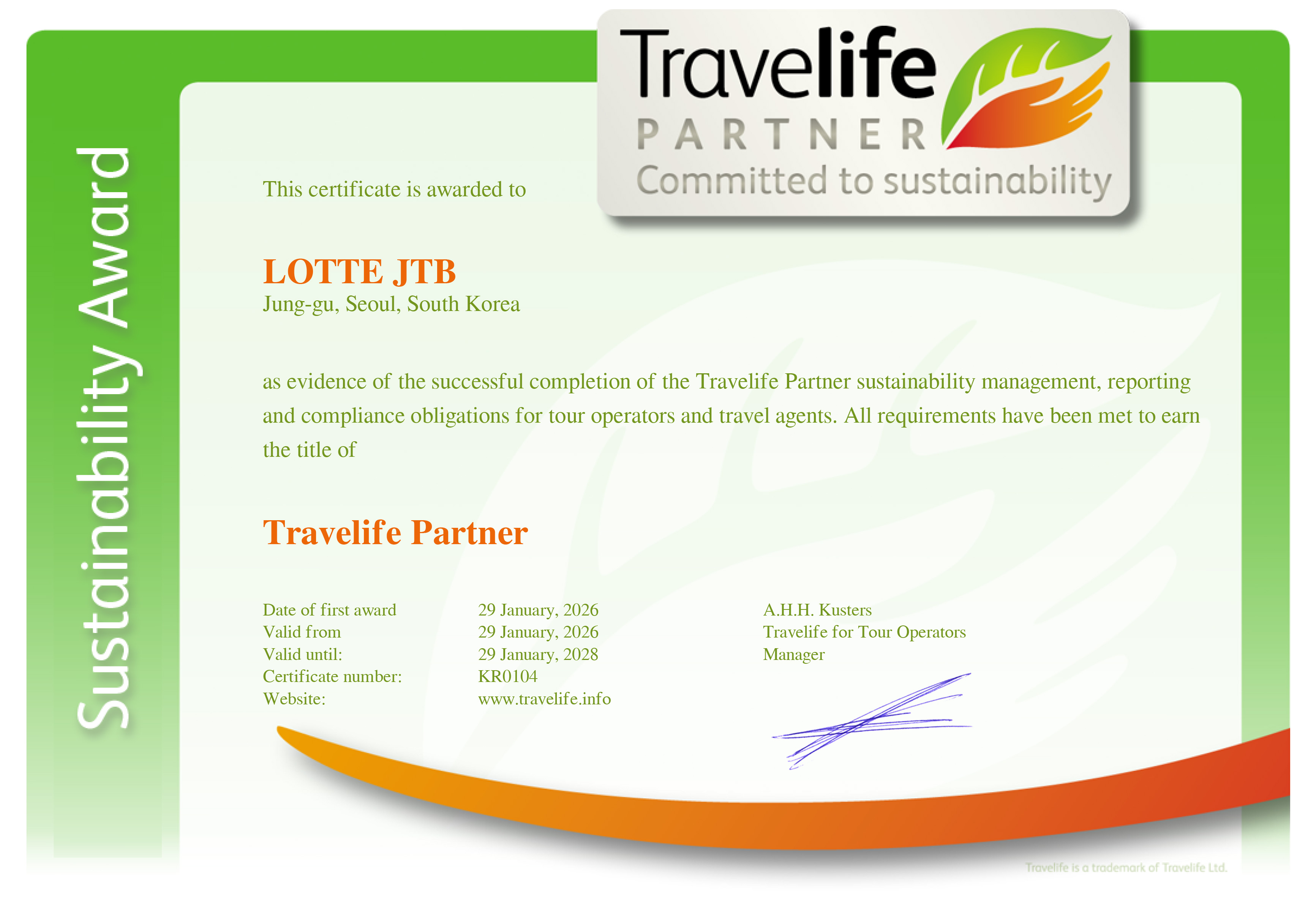 롯데제이티비는 Travelife Partner로서 사회적·환경적 지속가능성을 실천하기 위한 노력을 공식적으로 인정받았습니다. 지속가능경영, 사무 운영, 협력사와의 관계, 고객 커뮤니케이션 등 100개 이상의 엄격한 기준을 충족하고 있습니다. Travelife는 여행업계를 위한 3단계 국제 지속가능성 인증 프로그램으로, 현재 두 번째 단계인 Partner 자격을 보유하고 있습니다. 이에 만족하지 않고, 더 높은 수준의 책임 있는 여행을 실현하기 위해 최종 단계인 Travelife Certified 취득을 목표로 지속적인 개선을 이어가고 있습니다.